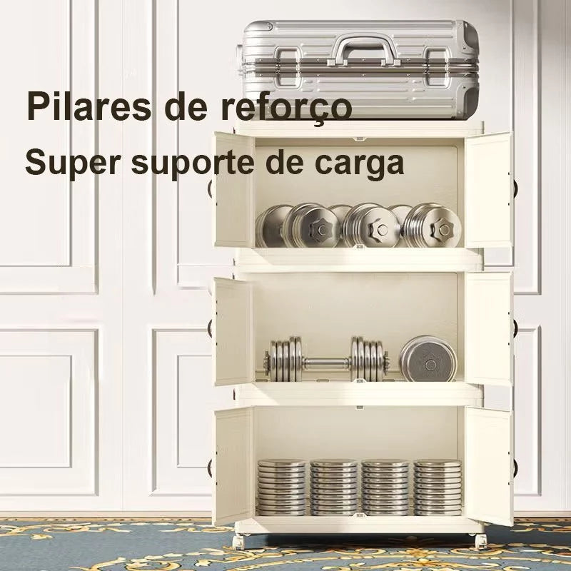 As portas com travas seguras facilitam o acesso aos itens sem precisar desmontar a pilha, e as rodinhas embutidas tornam o deslocamento leve e prático.